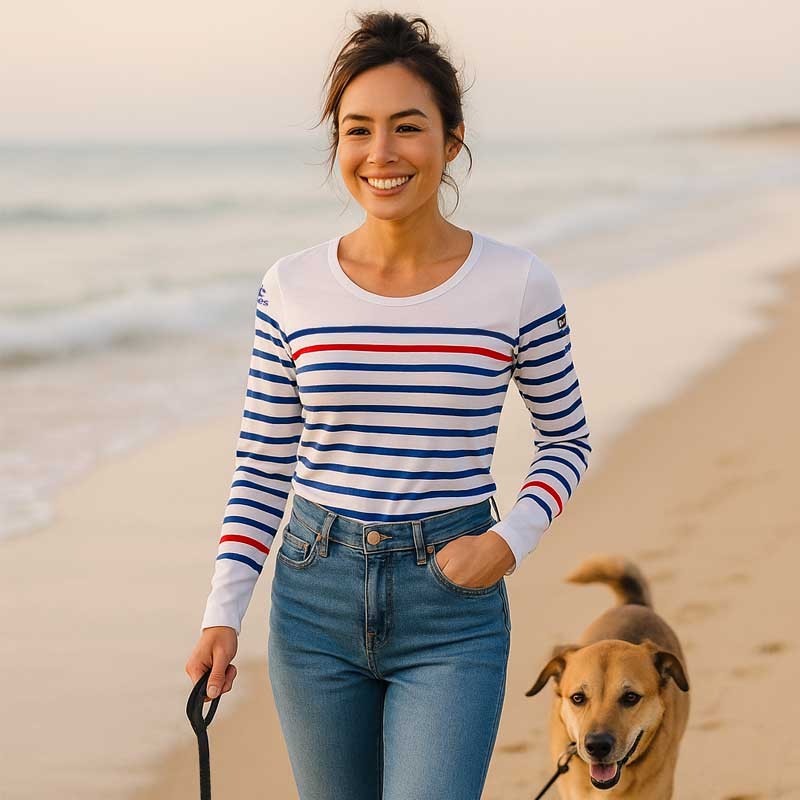 La marinière est réalisée avec le savoir-tricoter des ateliers Armor Lux, ce qui lui assure une solidité, une longévité et une qualité reconnues de la marque.